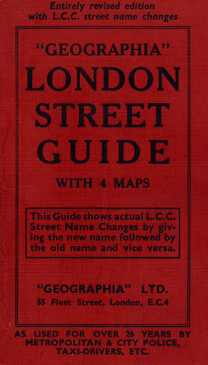 The Strand News Cinema (on map) opened in 1935 . The Bloomsbury Super (on map) closed in 1940. Post Office Station became St. Paul's (on map) in 1937, the same year the Morden-Edgware Line (on map) became the Northern Line. Highgate Station (on map) became Archway (Highgate) in 1939. Geographia was founded in 1911 and the guide had been published "for over 26 years". It is arranged into three columns; Street and Postal District, Nearest Main Thoroughfare and Nearest Station. There are about 7,500 entries, at least 1,500 of which are name changes. The rest constitute well under half of the Streets and Roads in the L.C.C. area and are mostly, but not exclusively, in the centre. Input from those with specialist or personal knowledge regarding its age or purpose is welcome. |