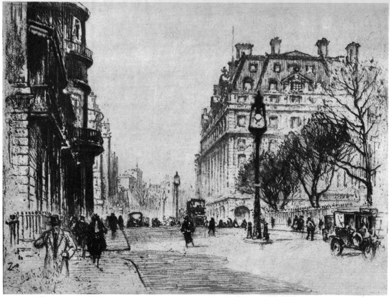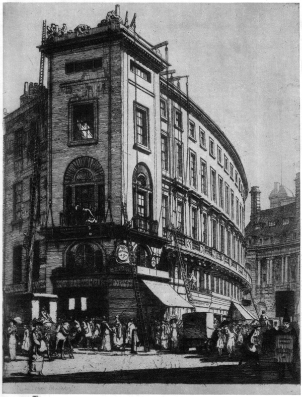 Individual instances such as these are always to be counted among the demolitions constantly taking place in our midst. Nothing is secure because Time is always bringing with it changes of ideas and the necessity for their expression in terms of architectural development. From great houses, like Devonshire House and Harcourt House and Northumberland House, which have gone, and Grosvenor House, which is going, to beautiful little dwellings like those in Paradise Row, at Chelsea, and little taverns like The Adam and Eve in the same picturesque locality, little is spared to us from other days, and were it not for the loving care with which artists have sought, and are daily seeking, to perpetuate the features of what has passed and is almost daily passing from us, their outlines, even the very memory of them, would soon be obliterated from our minds. For if it be difficult to reconstruct mentally the appearance of a building that has disappeared, it is ten times harder to do so when that building has been replaced by something wholly alien to it in size and in architectural style. But such constant happenings as these can only change the aspect of a district by their gradually cumulative effect. We sigh for the loss of some familiar landmark we have known all our lives, but to the superficial observer it is merely one more or less gone of the thousands of structures with which London is concerned. It is, however, altogether other guess-work when whole areas are laid in ruin and covered by immense buildings which not only entirely alter their appearance but their very alignment. During the last few years we have in London been confronted by two of these vast changes. Of these the former has now (so quickly does time fly in our hurried life), become familiar to us, and there is beginning to spring up a generation which remembers, but cannot for the life of it recall, the Strand and its northern purlieus as they were before the Aldwych curve and the Kingsway boulevard swept out of existence Holywell Street and Wych Street and the slums that lay behind them, filthy and fetid with the accumulated dirt and squalor of three centuries. We may, as I for one do, regret the disappearance of those twin streets which bore their antique air with something of a quiet distinction. They were not over-cleanly; they were narrow; and, in view of our modern Juggernautish traffic they were impossibly inconvenient. But what ghosts you saw (in the mind's eye) passing along them! what memories they evoked! what pleasures one of them the Booksellers Row of so many bargains they afforded ! They were the only two thoroughfares in all London which alone seemed to one to recall Gay's "Trivia." For in them all the déségremens and not a few of the joys, of walking the streets, as the poet depicts them, could be imagined, and some of both realised. Well, they are gone, and with them are gone so much that required removal; so much which, decorative as it was in the retrospect, was in reality an unwholesome area, hidden from the busy Strand, but always there like a festering wound covered by a cloth. When that great improvement (for even those who care for old landmarks cannot, I think, deny that it was one) took place, it was done thoroughly. Not merely were new and splendid streets run through the district, but all the low and squalid surroundings were cleared away. And parenthetically I may remark that this has nearly always been our custom, as differentiated from that of Paris (to take an instance where much re-building has occurred) where when a new boulevard or street is laid out, it cuts through the area like a knife, leaving cheek by jowl with it all sorts of ancient and un-cleanly little by-streets; so that immediately off the great flaring Boulevard Sebastopol we have the Rue Quincampoix essentially as it was in the seventeenth century, and the Rue des Lombards which dates from the thirteenth. But a more recent rebuilding scheme in London has driven the Aldwych-Kingsway improvement from our short memories, and the reconstruction of Regent Street is the latest, and what will doubtless for many a year stand forth as the most comprehensive, rehabilitation which London is likely to witness. I suppose as long at least as my generation encumbers the earth and remains in the way of the younger, there will always be argument, more or less heated, as to whether this is an improvement or not. Lord Beaconsfield on a famous occasion announced to a rather wondering assembly, à propos the origin of species, if I remember rightly, that he was "on the side of the angels." One would always, I suppose, like to be, as the safest place in a discussion; the trouble in this instance is, however, as to which is that side. Are the angels, one wonders, in favour of the immense structures that tower up towards their abode, and, to borrow the Horatian tag, strike the stars with their uplifted heads; or would they rather have retained that gracious curve which Nash gave to his street, and which has now entirely disappeared ? It is a moot point. In the new Regent Street we have many wonderful and some amazing buildings; and we creep about between these Brobdingnagian structures and wonder at their Vanbrugh-like proportions. We are, or at least some of us are, I imagine, proud at having produced such a thoroughfare of mausoleums, just as Cheops no doubt was when he saw the last stone placed on his pyramidal achievement. But there are some who regret the passing of the old street whose homogeneity is irretrievably lost and whose quiet distinction has been replaced by something very large and very expensive; but just a little ostentatious and, as some think, not a little vulgar. Well, there it is, and use will no doubt reconcile, but one cannot but remember such things as were most precious to many of us. With which adaptation of the famous phrase, I pass to a consideration of some of the etchings which the change has happily caused, and which